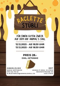 Der Winter lädt ein zum Geniessen – und unser Partnerverein Animal’s Soul, ein liebevoll geführter Pferde-Gnadenhof, bietet dafür den perfekten Rahmen. Beim gemütlichen Raclette-Stübli auf dem Hof in Stein erwartet euch ein Abend voller Wärme, Geschmack und Mitgefühl.