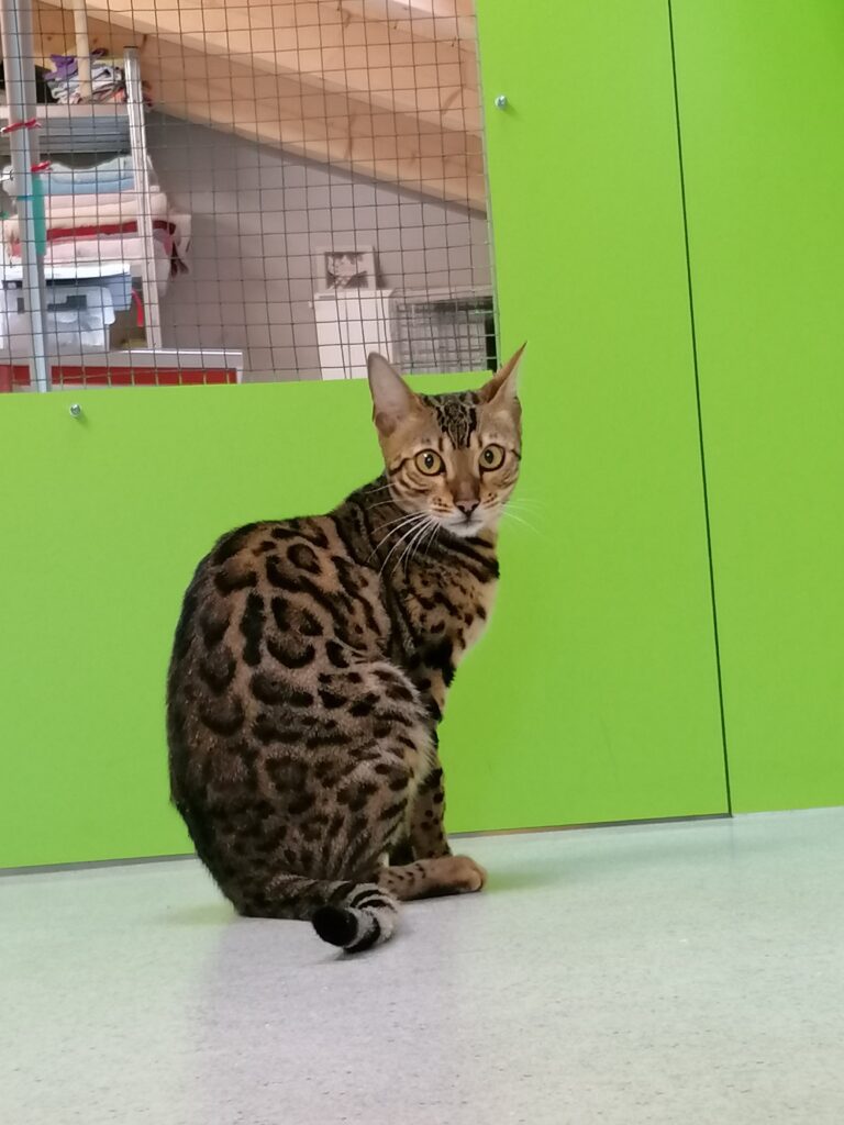 Die hübsche Bengaldame kam zusammen mit ihrer Mutter zu uns ins Katzenheim, weil die Besitzer umgezogen sind. Da sich die Mutter nur bedingt mit Angela verstanden hat, werden wir die beiden getrennt voneinander platzieren.
