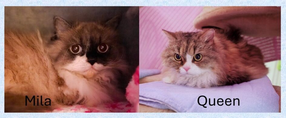 Das dichte, lockige Fell der beiden benötigt regelmässiges Bürsten, was sie jedoch sehr geniessen. Queen und Mila sind Wohnungskatzen, die nur gemeinsam in einen ruhigen Haushalt vermittelt werden, idealerweise ohne Kinder oder nur mit älteren, ruhigeren Kindern. Zu viel Trubel mögen sie nicht. Ein gesicherter Garten oder Balkon sollte vorhanden sein.