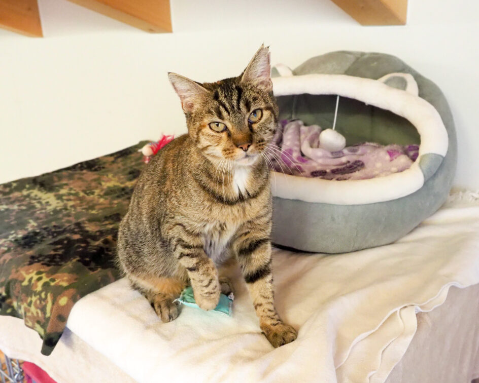 Minou kam Anfang Juni aus der Vermittlung zu uns zurück. Vor Kurzem hatte die sensible Katzendame einen Unfall, bei dem sie sich die Achillessehne gerissen hat. Die Verletzung wurde erfolgreich operiert, aber momentan braucht Minou noch strikte Boxenruhe, um sich vollständig zu erholen. Die Strapazen der letzten Zeit haben sie etwas mitgenommen, und sie ist aktuell noch etwas angeschlagen.