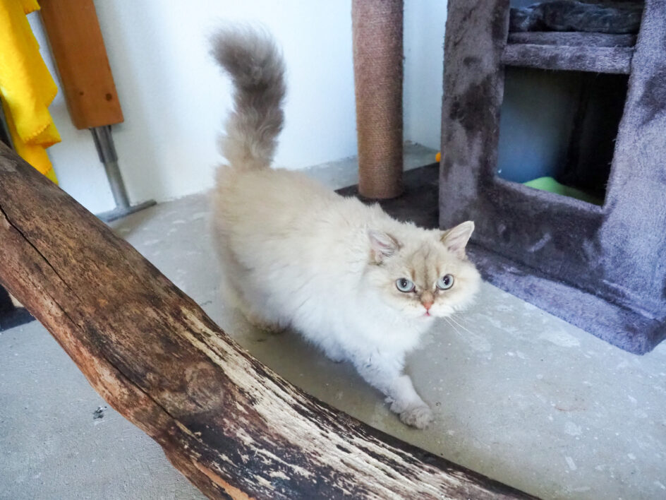 Shiva – Die cremefarbene Perserdame ist die ältere der beiden. Sie ist eine wahre Kuschelkatze, sehr anhänglich und liebt es, Zeit mit ihren Menschen zu verbringen. Aufgrund ihres Perserfells benötigt sie regelmäßige Fellpflege – momentan ist sie geschoren, da sie stark verfilzt war. Shiva hat ihren eigenen Kopf und kann ihren Willen durchsetzen, bleibt dabei aber immer freundlich und aufgeschlossen. Rocky – Der grau-weiße Hauskater ist etwas jünger als Shiva. Auch er ist verschmust und genießt es, gestreichelt zu werden. Rocky zeigt sich gegenüber fremden Katzen dominant, weshalb die beiden ausschließlich als Paar und ohne weitere Tiere vermittelt werden. Shiva und Rocky hängen sehr aneinander und werden daher nur gemeinsam vermittelt.